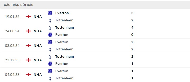 Thành tích đối đầu giữa Everton vs Tottenham