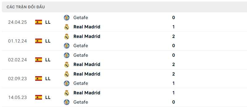 Thành tích đối đầu giữa Getafe vs Real Madrid