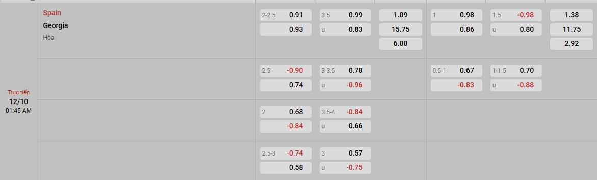 Nhà cái đặt kèo chấp 2.25 bàn thắng với việc Tây Ban Nha là đội cửa trên. Đây là một điều dễ hiểu khi Tây Ban Nha được đánh giá cao hơn mọi mặt và sẽ được thi đấu trên sân nhà. Thêm vào đó, trong 4 chiến thắng gần nhất của Bò Tót trước Georgia, họ đều tạo ra cách biệt từ 2 bàn thắng trở lên.