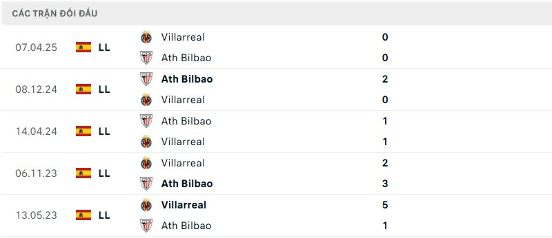 Thành tích đối đầu giữa Villarreal vs Bilbao